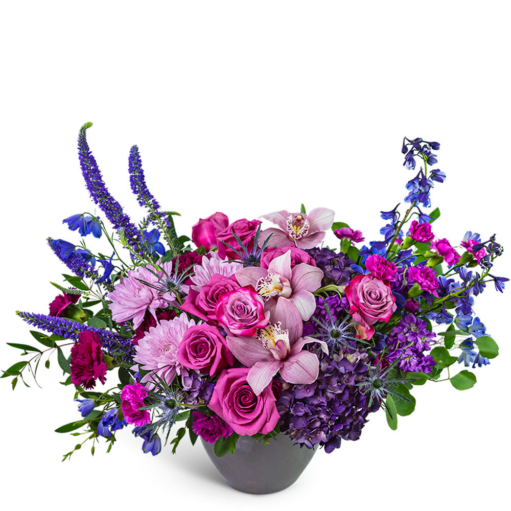 Moonlight in Tahiti is a luxurious blend of Roses, Cymbidium Orchids, Hydrangea, and accent blooms in deep violet hues, arranged in a sleek granite-colored vase. This elegant flower arrangement makes a dramatic centerpiece for celebrations, upscale events, or a stunning flower delivery. Our floral designer may make thoughtful substitutions while maintaining the overall look of the arrangement.