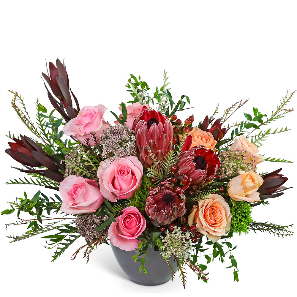 Wild Rose Aura is a striking, high-end flower arrangement featuring Protea, Roses, Berries, and unique accent flowers with premium foliage. Designed in a granite-colored vase, it's perfect for birthdays, thank yous, or anytime you want to send a luxurious flower delivery. Our floral designer may make thoughtful substitutions while maintaining the overall look of the arrangement.